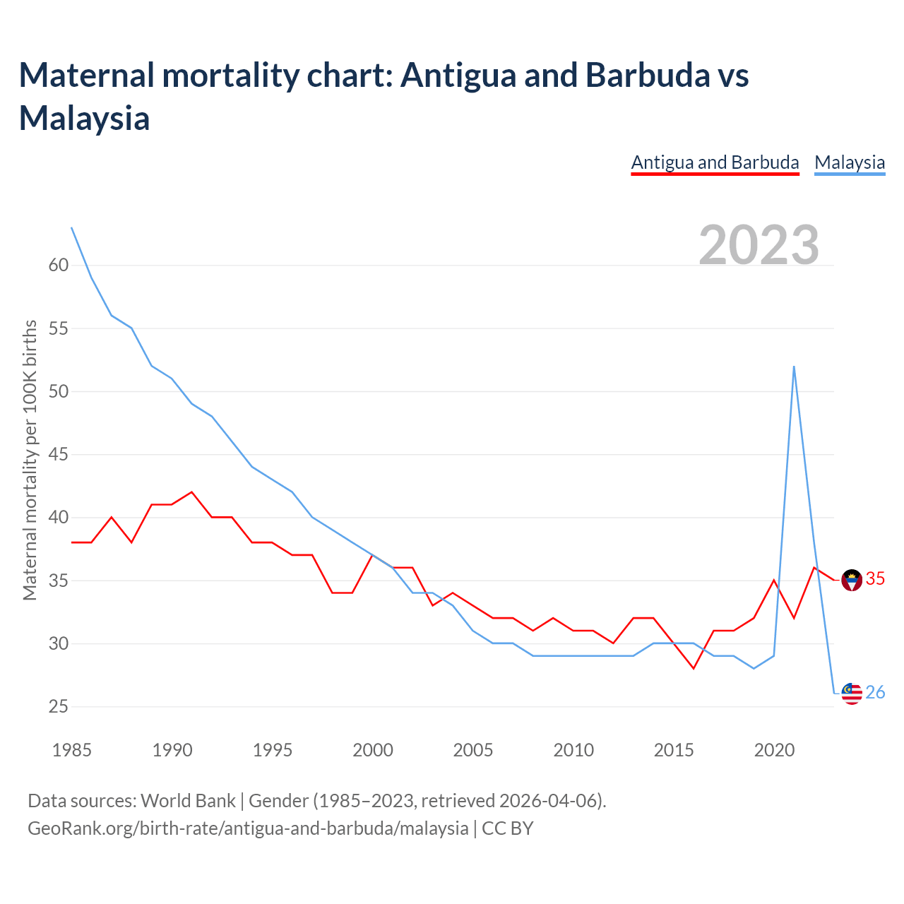 The maternal mortality rate, which is the probability of dying during childbirth or within 42 days of pregnancy termination, is 35 deaths per 100,000 live births in Antigua and Barbuda, compared to 26 deaths in Malaysia.