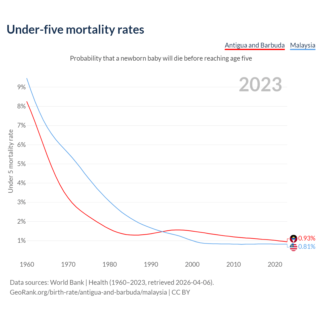 The chance that a newborn baby will die before reaching age five is 0.93% in Antigua and Barbuda and 0.81% in Malaysia. Above is a chart with historical data on under-five mortality rates.