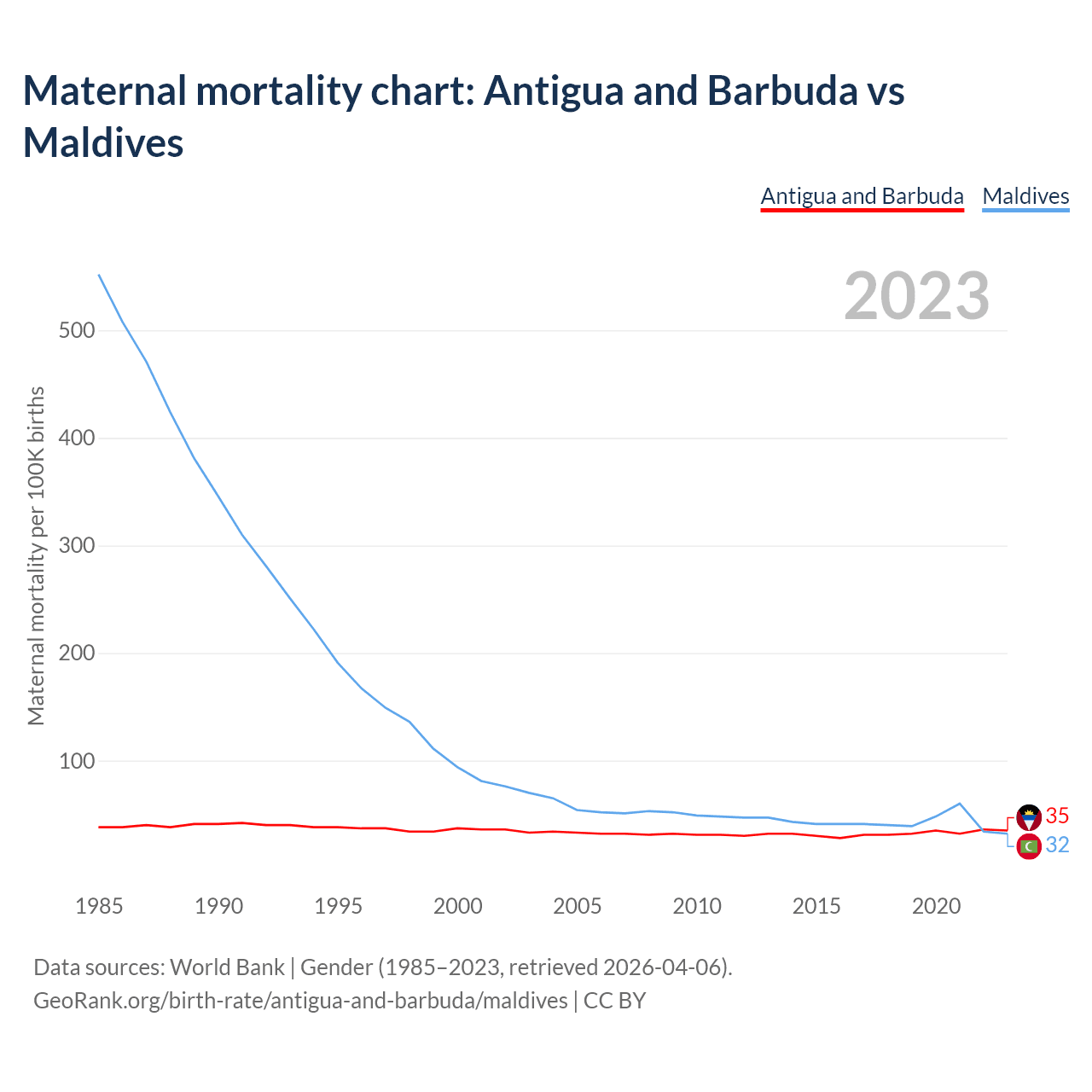 The maternal mortality rate, which is the probability of dying during childbirth or within 42 days of pregnancy termination, is 35 deaths per 100,000 live births in Antigua and Barbuda, compared to 32 deaths in Maldives.