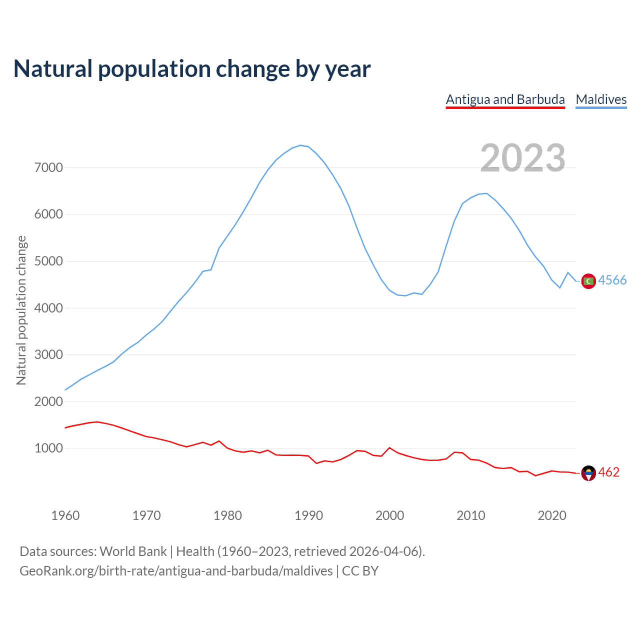 - Antigua and Barbuda is ranked 117/196 by birth rate compared to 131/196 for Maldives.