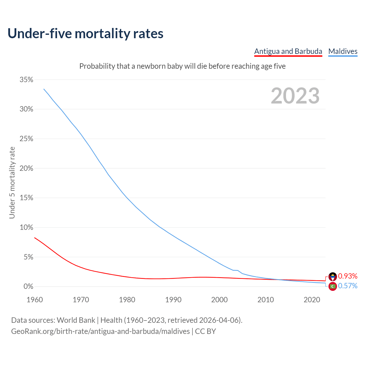 The chance that a newborn baby will die before reaching age five is 0.93% in Antigua and Barbuda and 0.57% in Maldives. Above is a chart with historical data on under-five mortality rates.