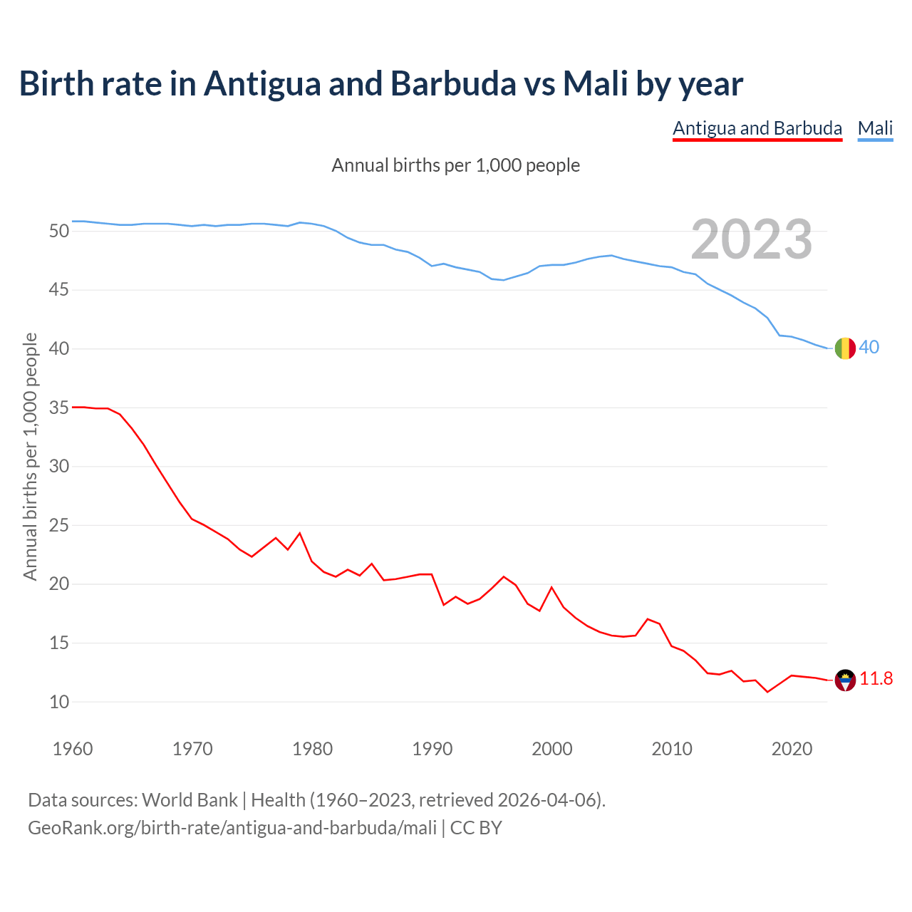 Antigua and Barbuda has an annual birth rate of 11.8 births per 1,000 people, compared to 40 for Mali. The average number of children a woman is expected to have during her lifetime — the fertility rate, is 1.58 in Antigua and Barbuda and 5.61 in Mali — 255.8% difference.