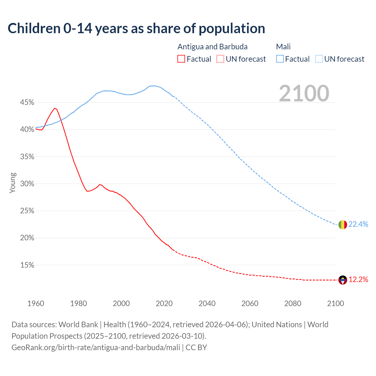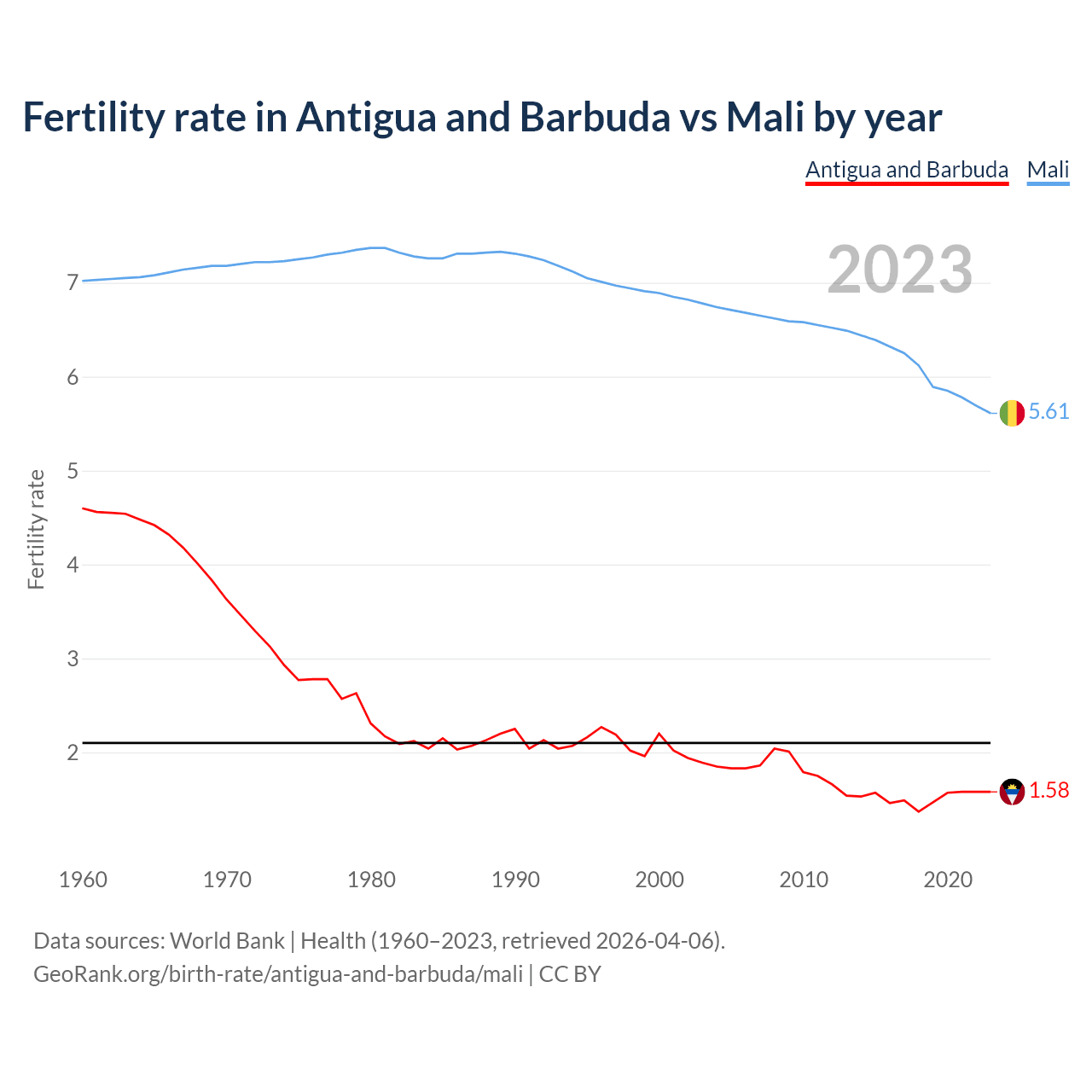 According to the latest available data on birth rates, the fertility rate in Antigua and Barbuda was 1.58 children per woman in 2023, compared to 5.61 in Mali in 2023. The replacement level is considered to be 2.1 children per woman.
