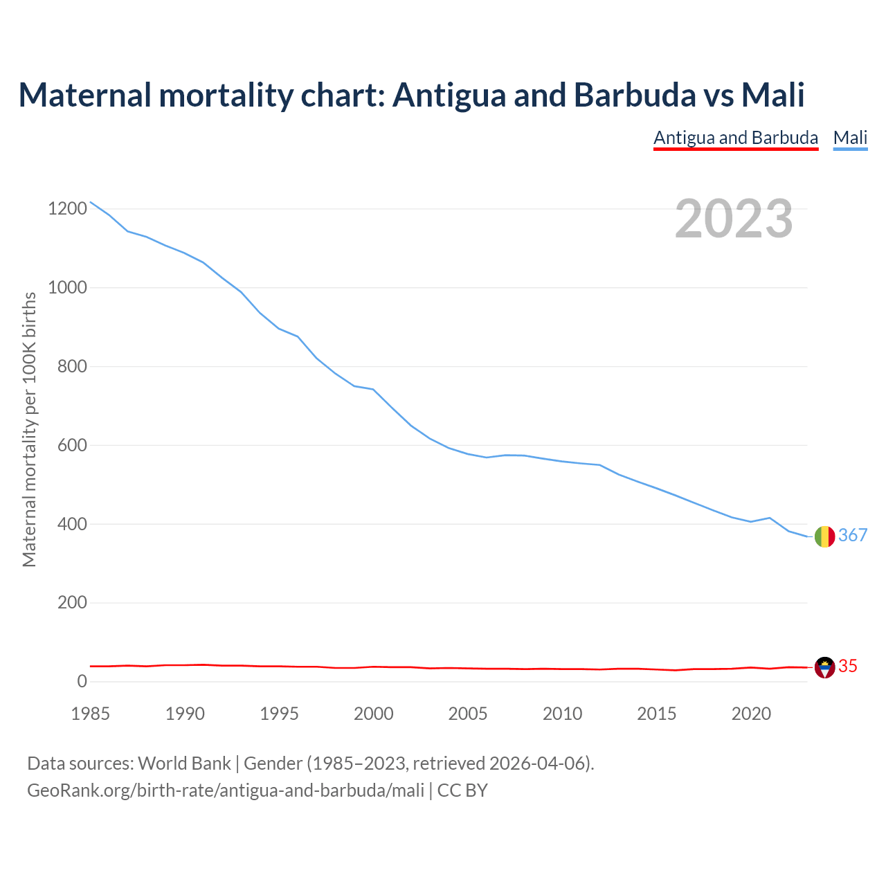 The maternal mortality rate, which is the probability of dying during childbirth or within 42 days of pregnancy termination, is 35 deaths per 100,000 live births in Antigua and Barbuda, compared to 367 deaths in Mali.