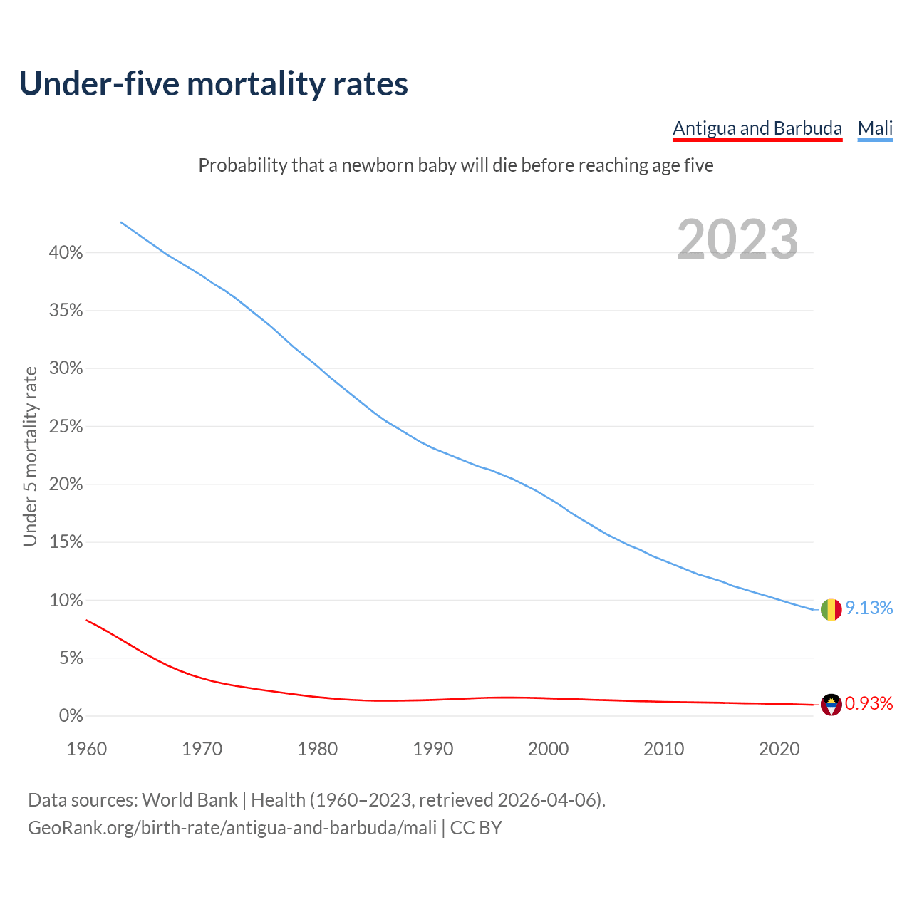 The chance that a newborn baby will die before reaching age five is 0.93% in Antigua and Barbuda and 9.13% in Mali. Above is a chart with historical data on under-five mortality rates.