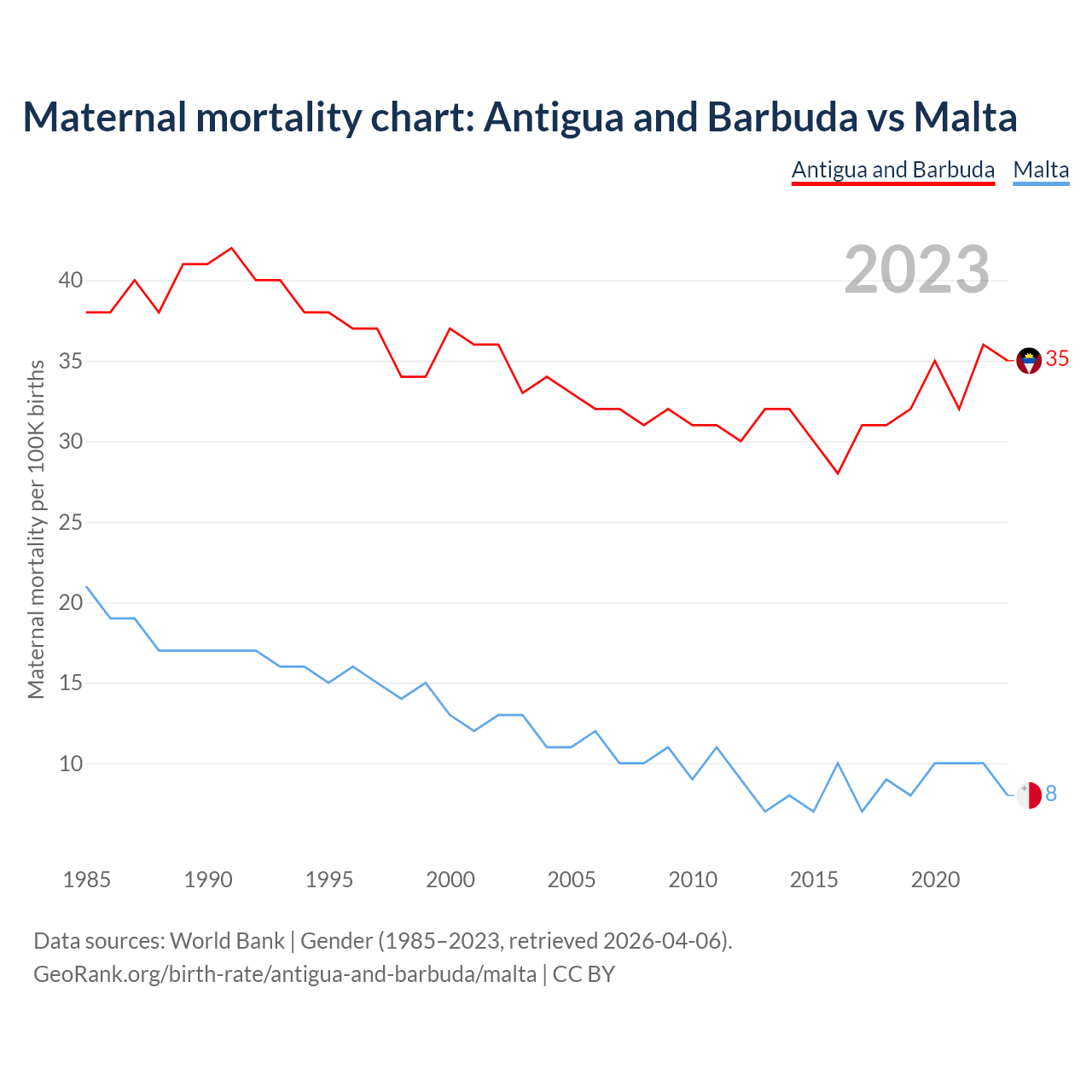 The maternal mortality rate, which is the probability of dying during childbirth or within 42 days of pregnancy termination, is 35 deaths per 100,000 live births in Antigua and Barbuda, compared to 8 deaths in Malta.