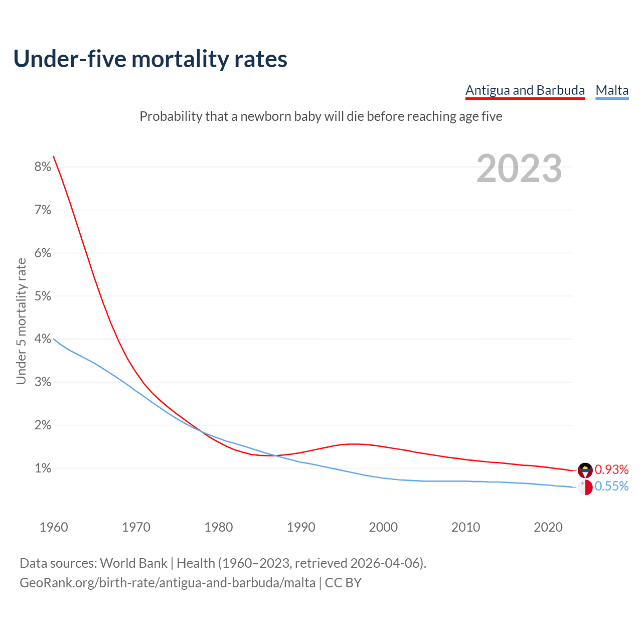 The chance that a newborn baby will die before reaching age five is 0.93% in Antigua and Barbuda and 0.55% in Malta. Above is a chart with historical data on under-five mortality rates.