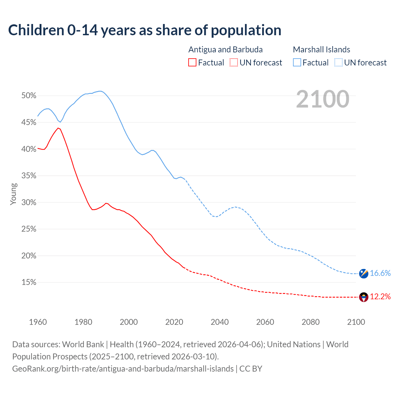 According to the latest available data on birth rates, the fertility rate in Antigua and Barbuda was 1.58 children per woman in 2023, compared to 2.92 in the Marshall Islands in 2023. The replacement level is considered to be 2.1 children per woman.