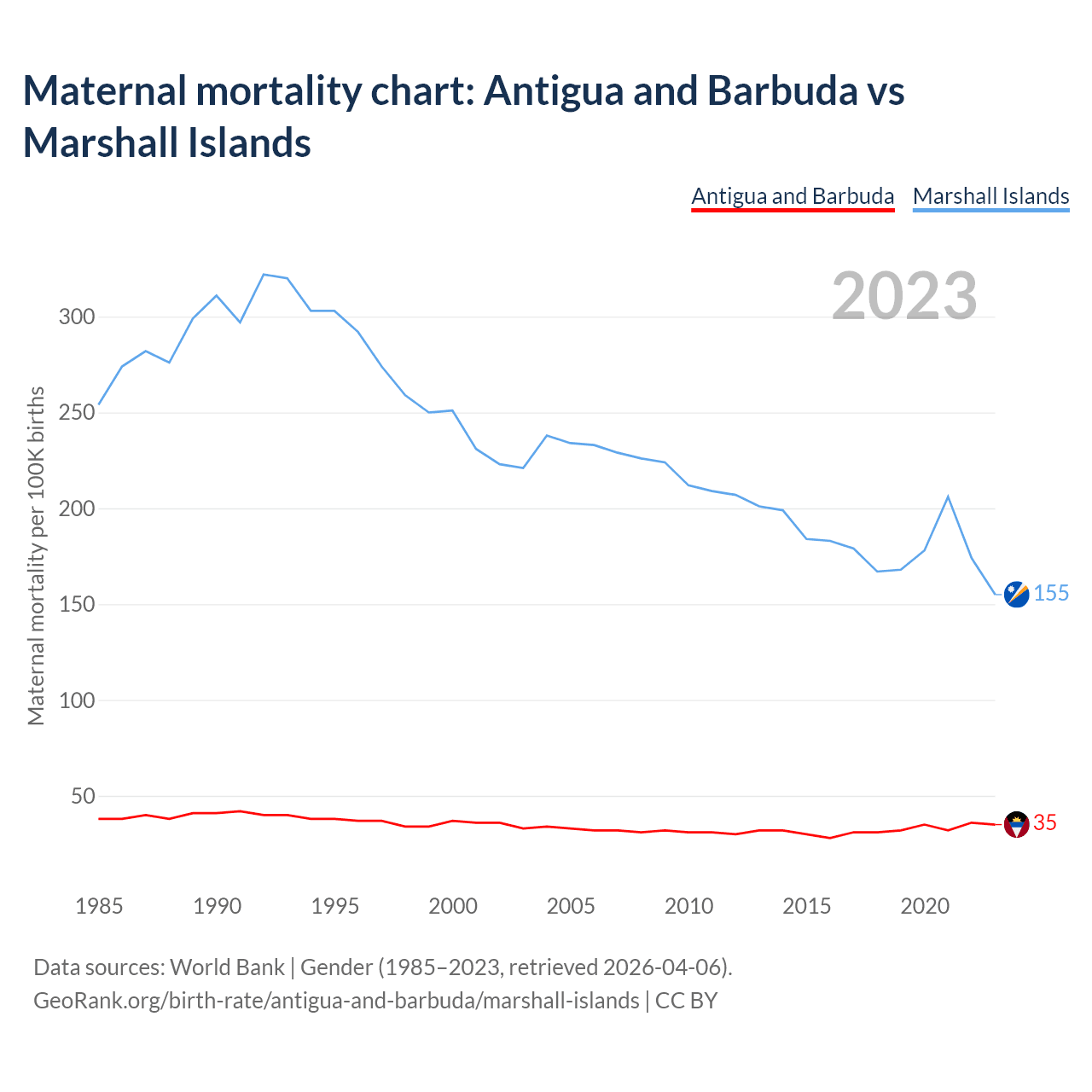 The maternal mortality rate, which is the probability of dying during childbirth or within 42 days of pregnancy termination, is 35 deaths per 100,000 live births in Antigua and Barbuda, compared to 155 deaths in the Marshall Islands.