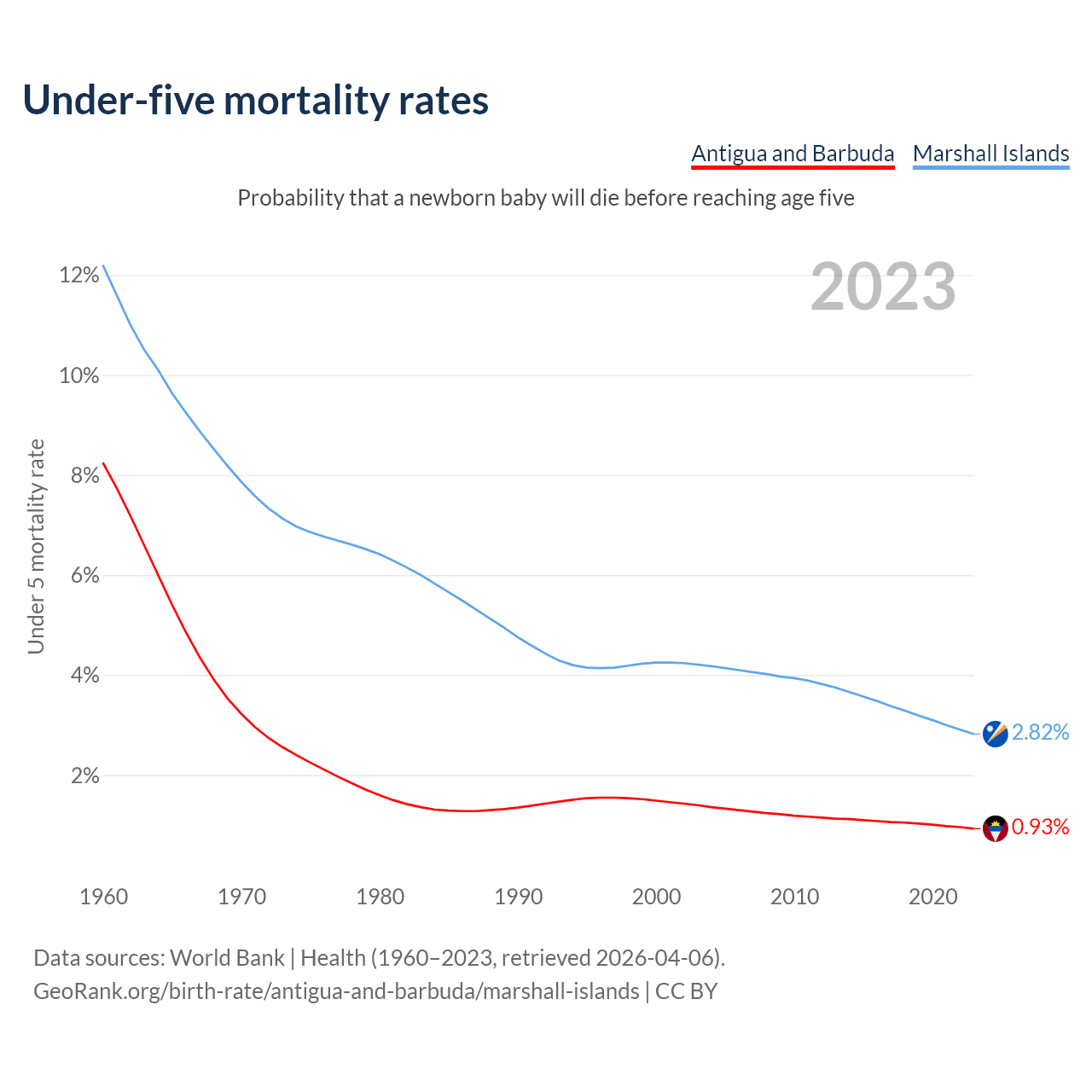 The chance that a newborn baby will die before reaching age five is 0.93% in Antigua and Barbuda and 2.82% in the Marshall Islands. Above is a chart with historical data on under-five mortality rates.