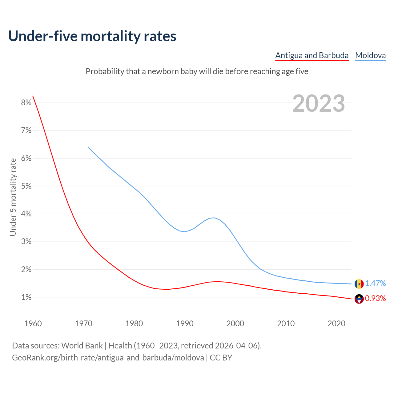 The chance that a newborn baby will die before reaching age five is 0.93% in Antigua and Barbuda and 1.47% in Moldova. Above is a chart with historical data on under-five mortality rates.