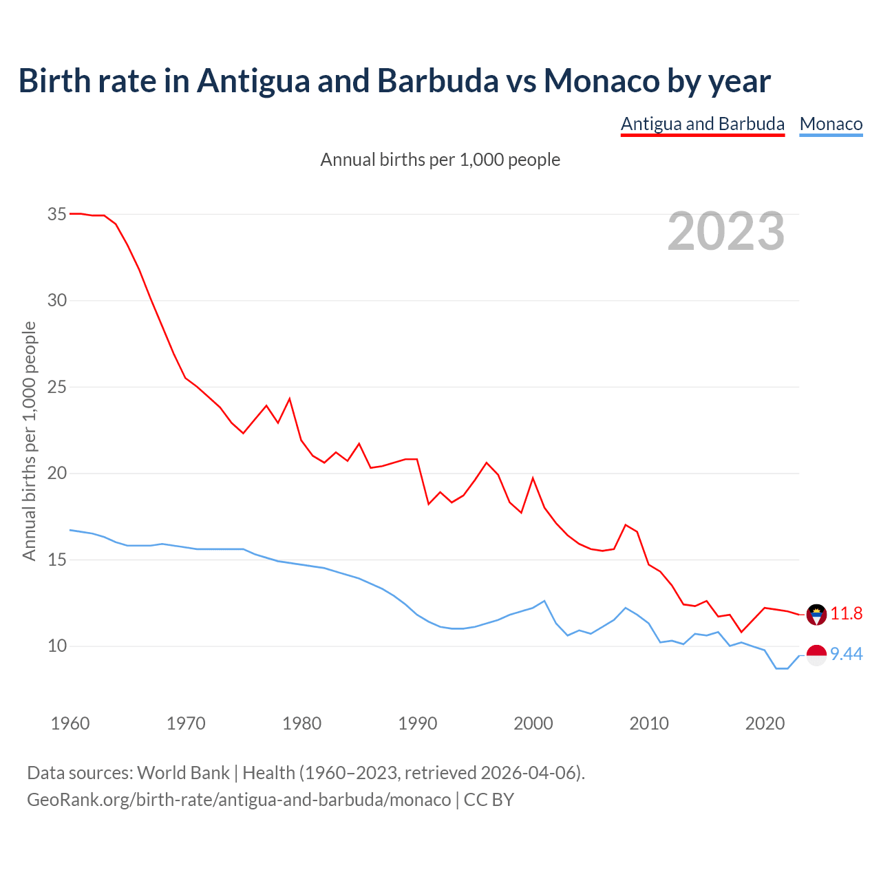 Antigua and Barbuda has an annual birth rate of 11.8 births per 1,000 people, compared to 9.44 for Monaco. The average number of children a woman is expected to have during her lifetime — the fertility rate, is 1.58 in Antigua and Barbuda and 2.11 in Monaco — 33.7% difference.
