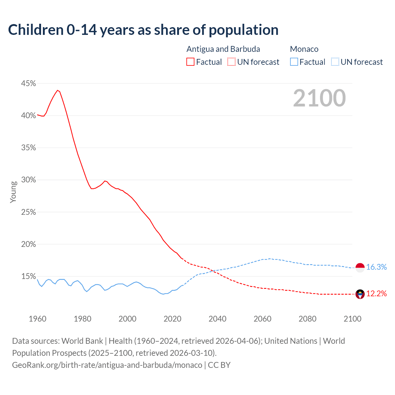According to the latest available data on birth rates, the fertility rate in Antigua and Barbuda was 1.58 children per woman in 2023, compared to 2.11 in Monaco in 2023. The replacement level is considered to be 2.1 children per woman.