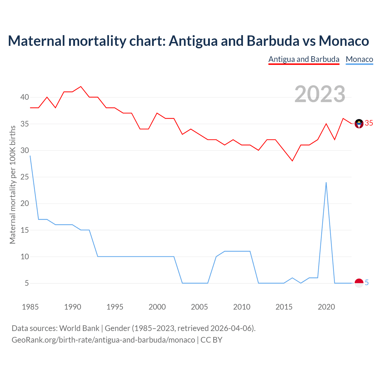The maternal mortality rate, which is the probability of dying during childbirth or within 42 days of pregnancy termination, is 35 deaths per 100,000 live births in Antigua and Barbuda, compared to 5 deaths in Monaco.
