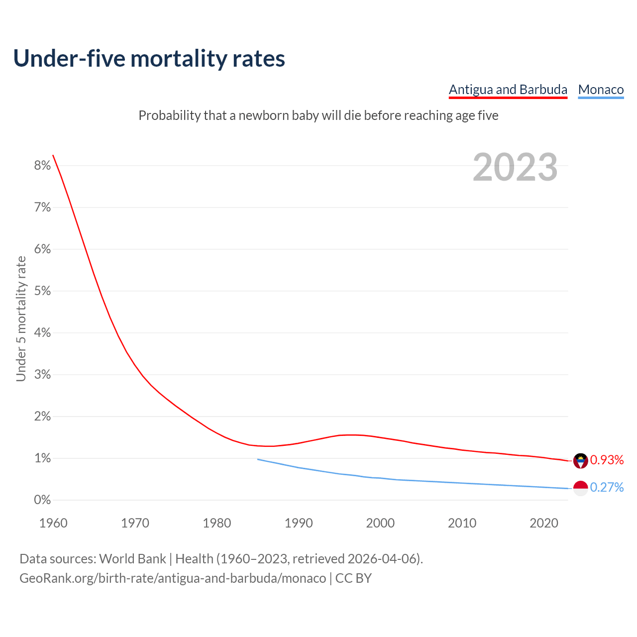 The chance that a newborn baby will die before reaching age five is 0.93% in Antigua and Barbuda and 0.27% in Monaco. Above is a chart with historical data on under-five mortality rates.