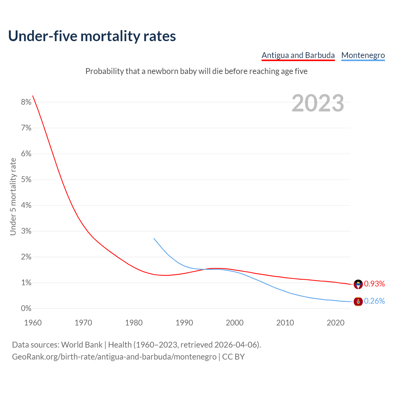 The chance that a newborn baby will die before reaching age five is 0.93% in Antigua and Barbuda and 0.26% in Montenegro. Above is a chart with historical data on under-five mortality rates.