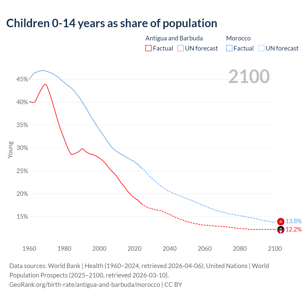 According to the latest available data on birth rates, the fertility rate in Antigua and Barbuda was 1.58 children per woman in 2023, compared to 2.23 in Morocco in 2023. The replacement level is considered to be 2.1 children per woman.