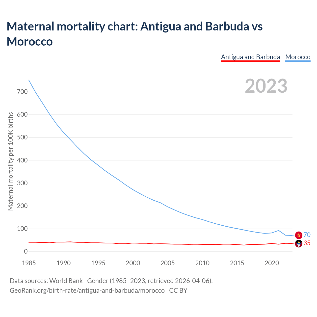 The maternal mortality rate, which is the probability of dying during childbirth or within 42 days of pregnancy termination, is 35 deaths per 100,000 live births in Antigua and Barbuda, compared to 70 deaths in Morocco.