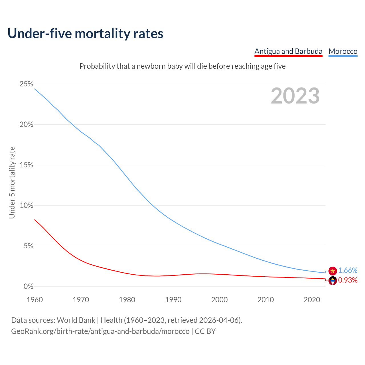 The chance that a newborn baby will die before reaching age five is 0.93% in Antigua and Barbuda and 1.66% in Morocco. Above is a chart with historical data on under-five mortality rates.