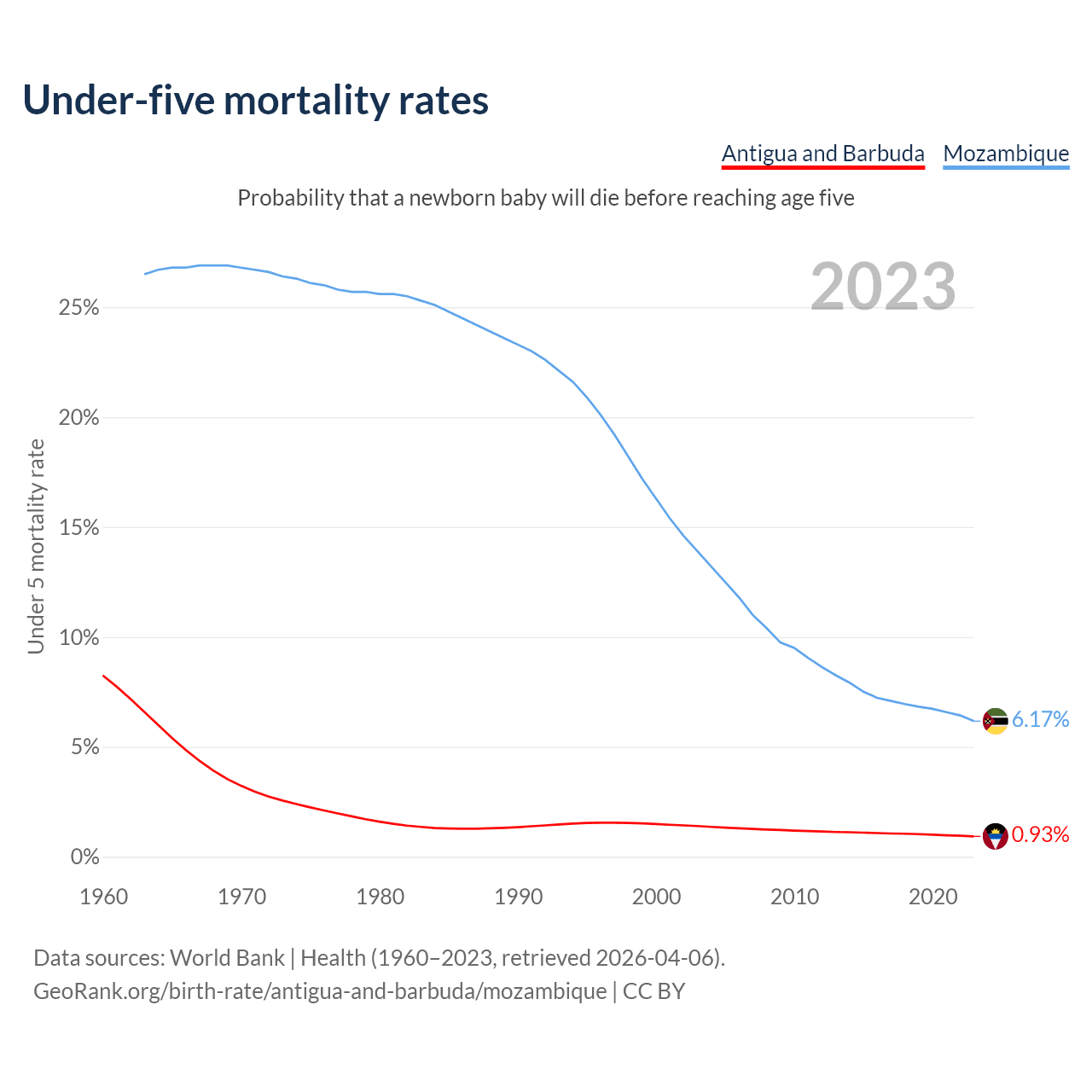 The chance that a newborn baby will die before reaching age five is 0.93% in Antigua and Barbuda and 6.17% in Mozambique. Above is a chart with historical data on under-five mortality rates.