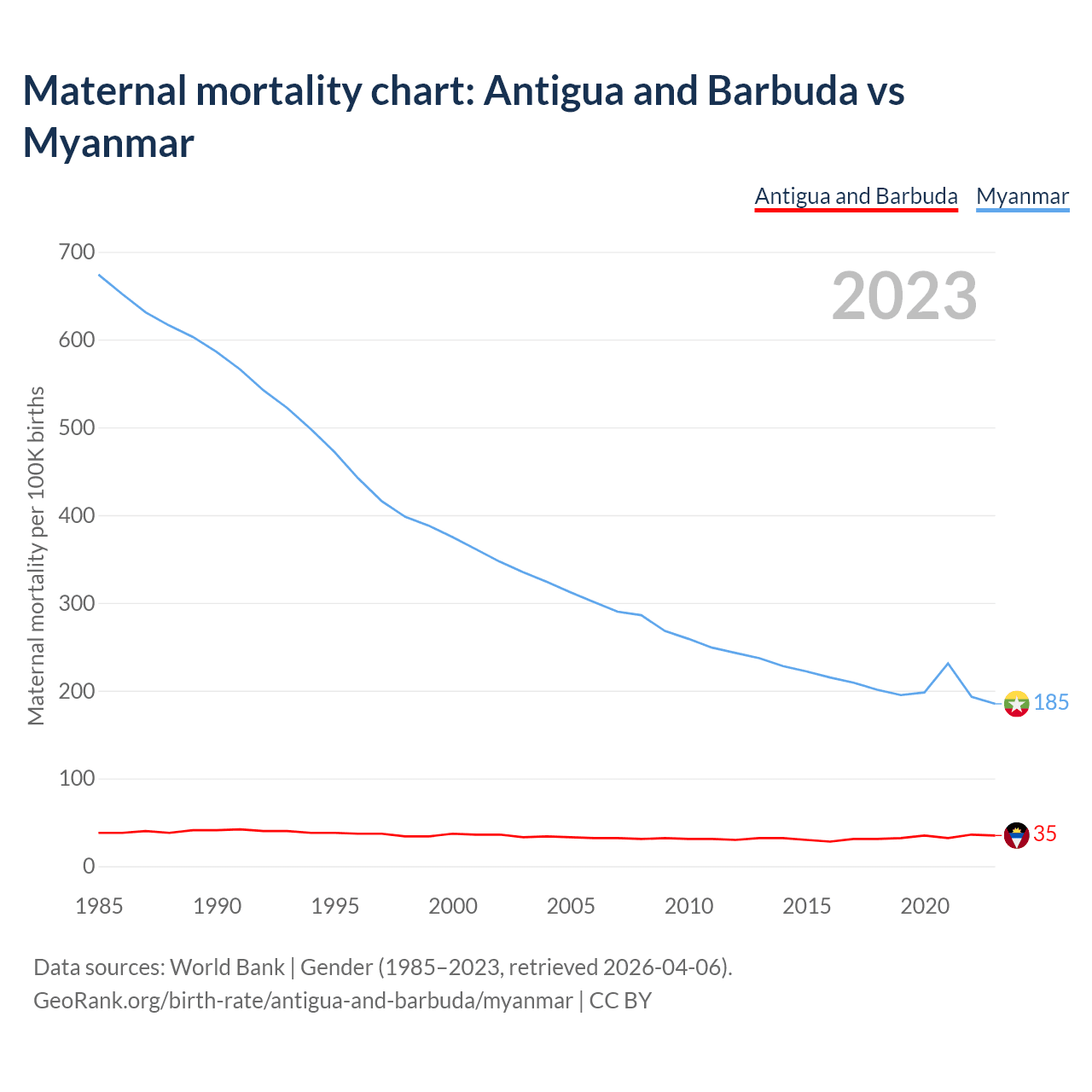The maternal mortality rate, which is the probability of dying during childbirth or within 42 days of pregnancy termination, is 35 deaths per 100,000 live births in Antigua and Barbuda, compared to 185 deaths in Myanmar.