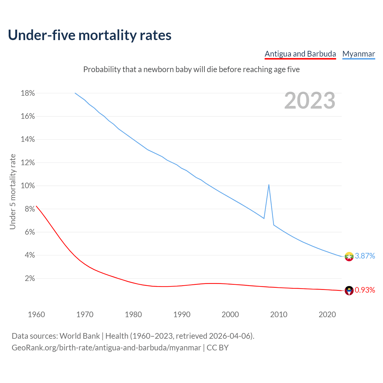 The chance that a newborn baby will die before reaching age five is 0.93% in Antigua and Barbuda and 3.87% in Myanmar. Above is a chart with historical data on under-five mortality rates.