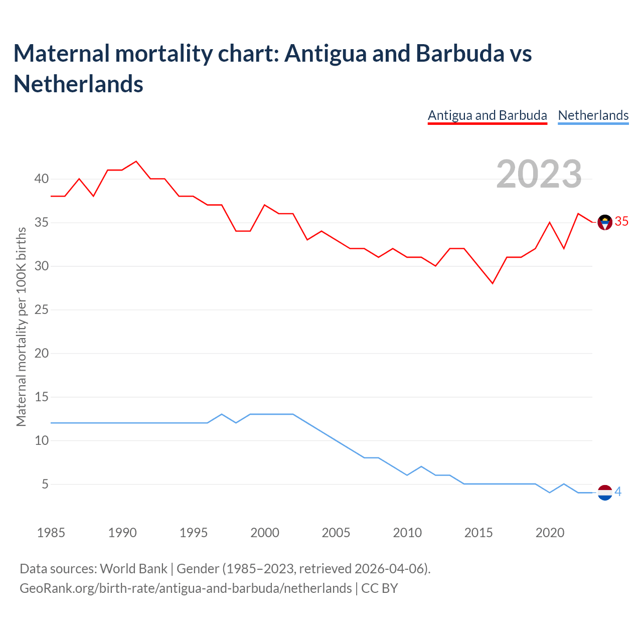 The maternal mortality rate, which is the probability of dying during childbirth or within 42 days of pregnancy termination, is 35 deaths per 100,000 live births in Antigua and Barbuda, compared to 4 deaths in the Netherlands.