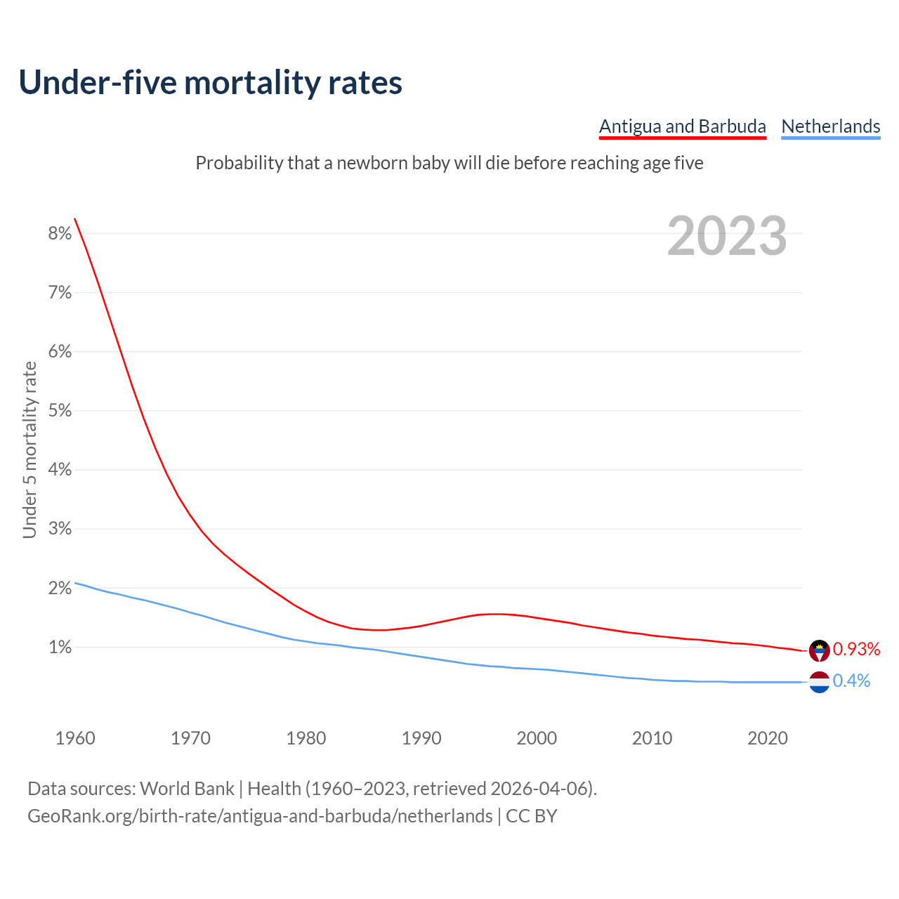 The chance that a newborn baby will die before reaching age five is 0.93% in Antigua and Barbuda and 0.4% in the Netherlands. Above is a chart with historical data on under-five mortality rates.