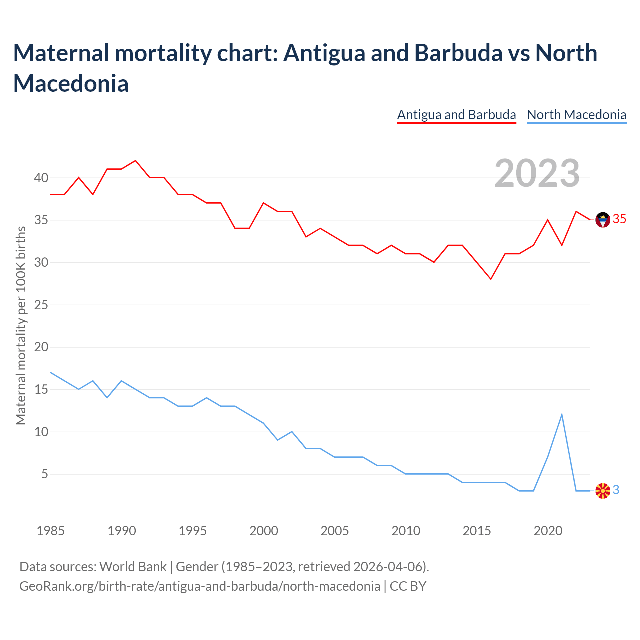 The maternal mortality rate, which is the probability of dying during childbirth or within 42 days of pregnancy termination, is 35 deaths per 100,000 live births in Antigua and Barbuda, compared to 3 deaths in North Macedonia.