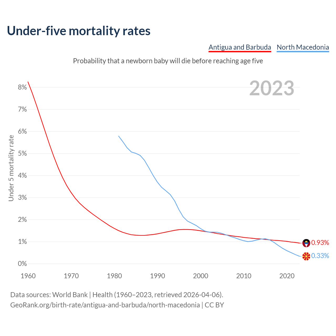 The chance that a newborn baby will die before reaching age five is 0.93% in Antigua and Barbuda and 0.33% in North Macedonia. Above is a chart with historical data on under-five mortality rates.