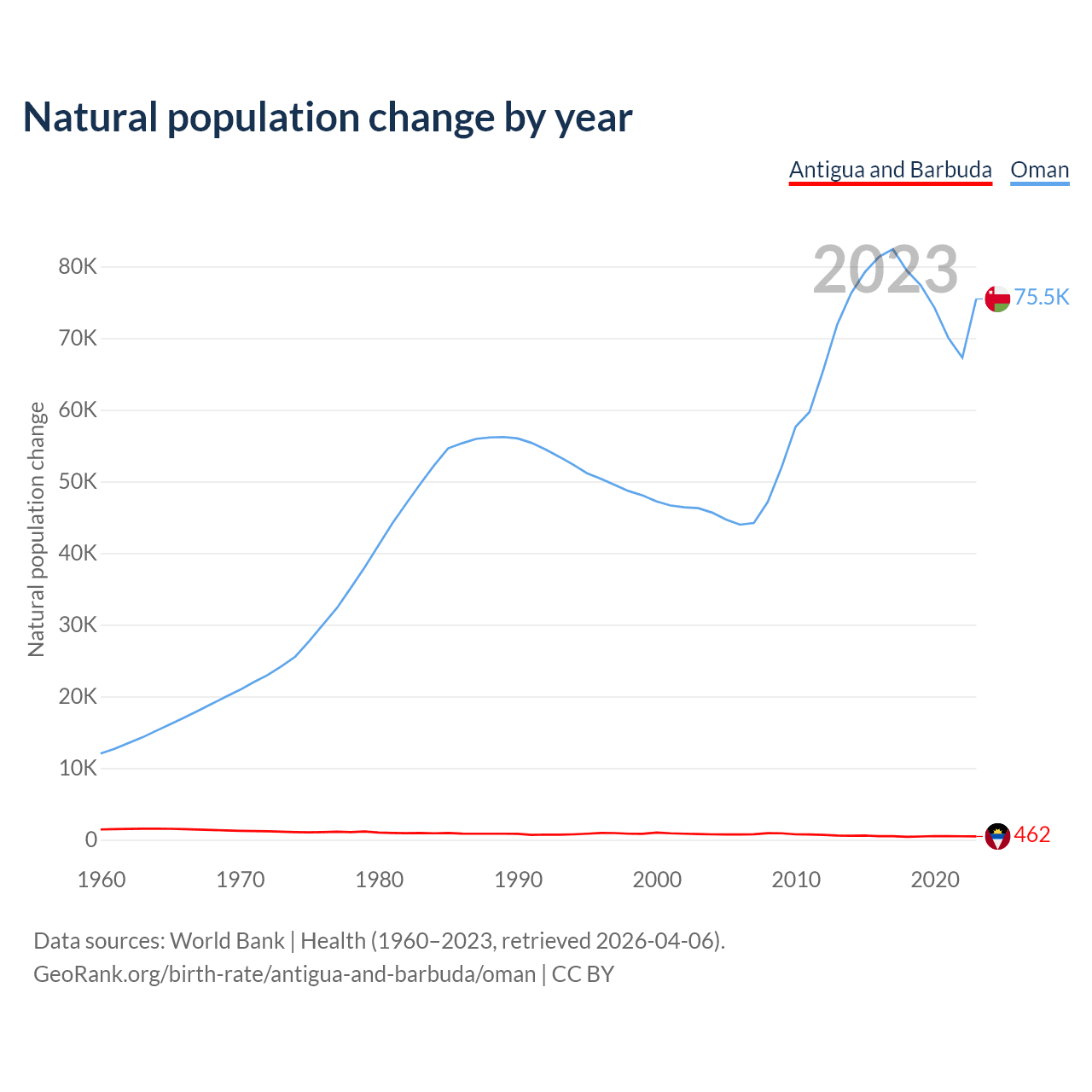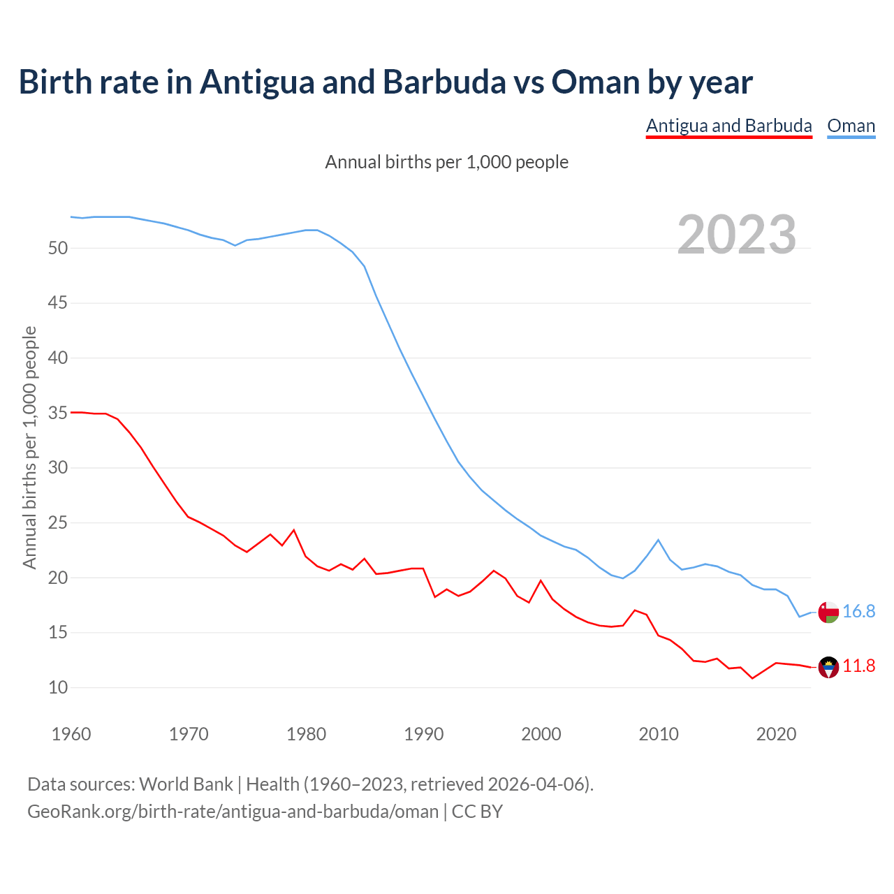 Antigua and Barbuda has an annual birth rate of 11.8 births per 1,000 people, compared to 16.8 for Oman. The average number of children a woman is expected to have during her lifetime — the fertility rate, is 1.58 in Antigua and Barbuda and 2.53 in Oman — 60% difference.