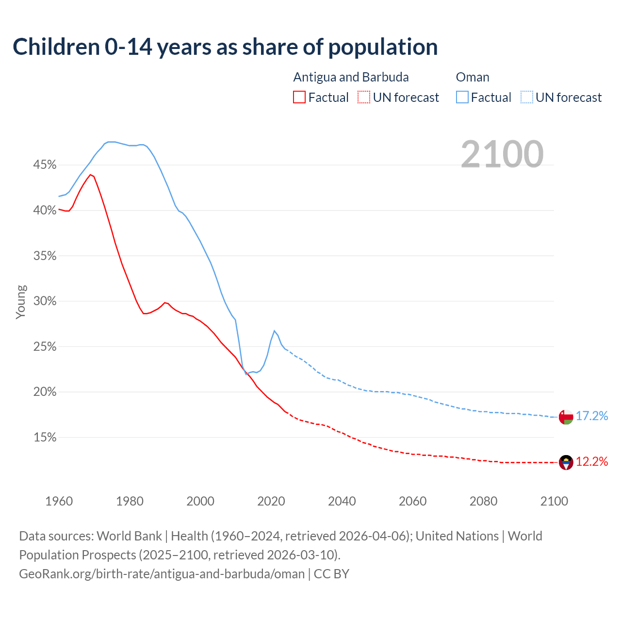 According to the latest available data on birth rates, the fertility rate in Antigua and Barbuda was 1.58 children per woman in 2023, compared to 2.53 in Oman in 2023. The replacement level is considered to be 2.1 children per woman.