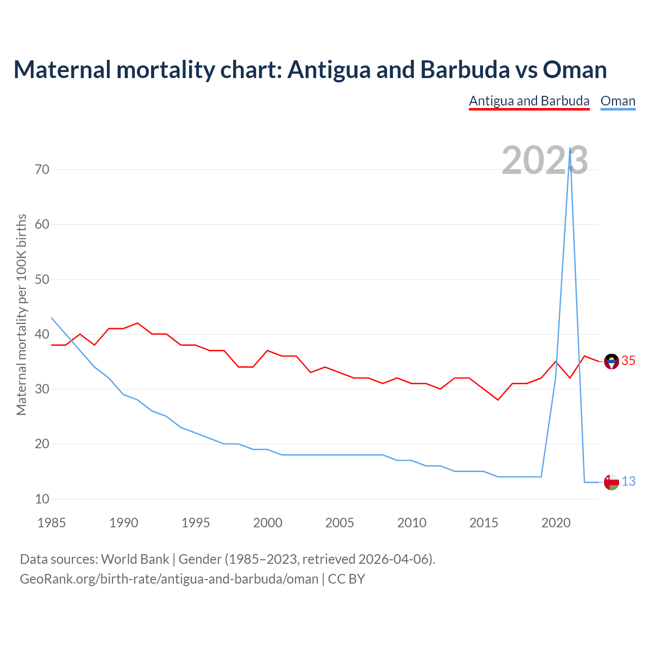 The maternal mortality rate, which is the probability of dying during childbirth or within 42 days of pregnancy termination, is 35 deaths per 100,000 live births in Antigua and Barbuda, compared to 13 deaths in Oman.