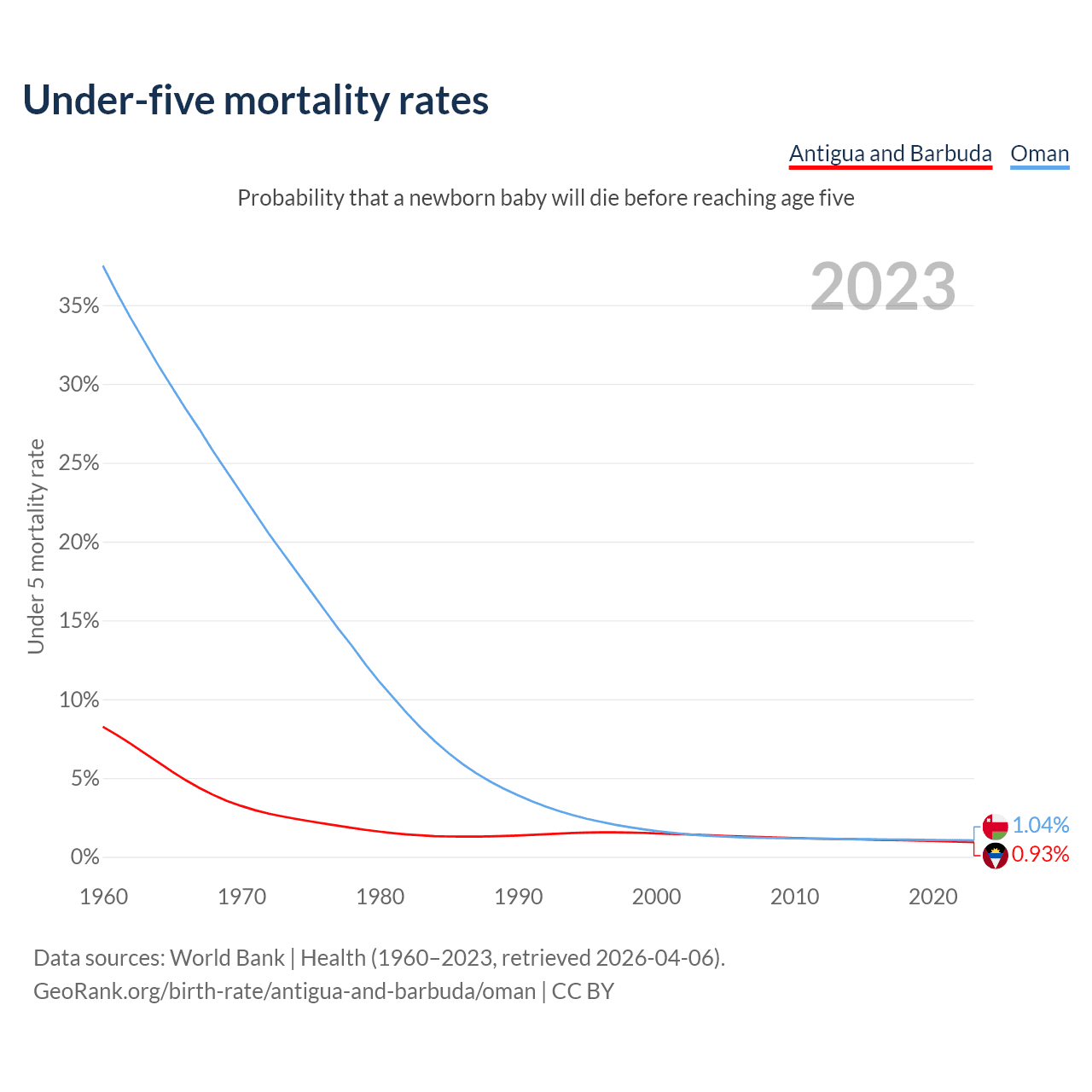 The chance that a newborn baby will die before reaching age five is 0.93% in Antigua and Barbuda and 1.04% in Oman. Above is a chart with historical data on under-five mortality rates.