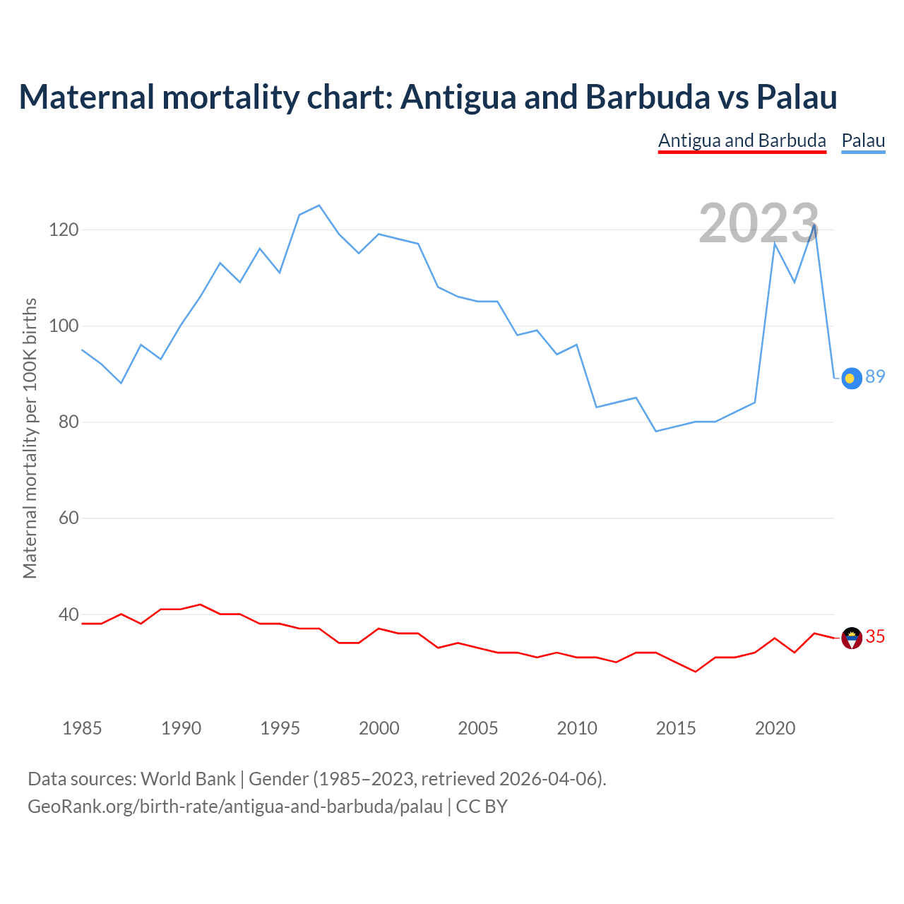 The maternal mortality rate, which is the probability of dying during childbirth or within 42 days of pregnancy termination, is 35 deaths per 100,000 live births in Antigua and Barbuda, compared to 89 deaths in Palau.