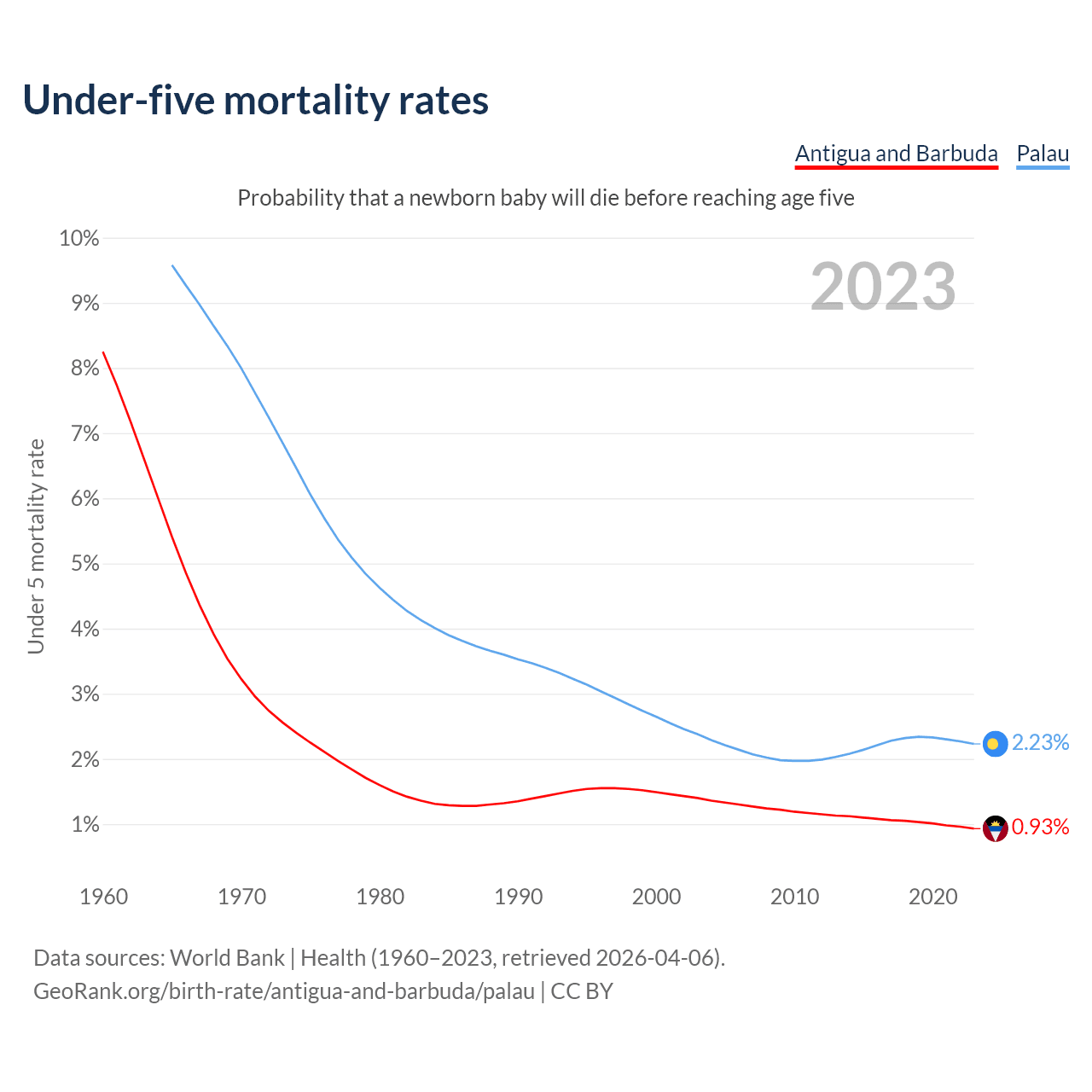 The chance that a newborn baby will die before reaching age five is 0.93% in Antigua and Barbuda and 2.23% in Palau. Above is a chart with historical data on under-five mortality rates.