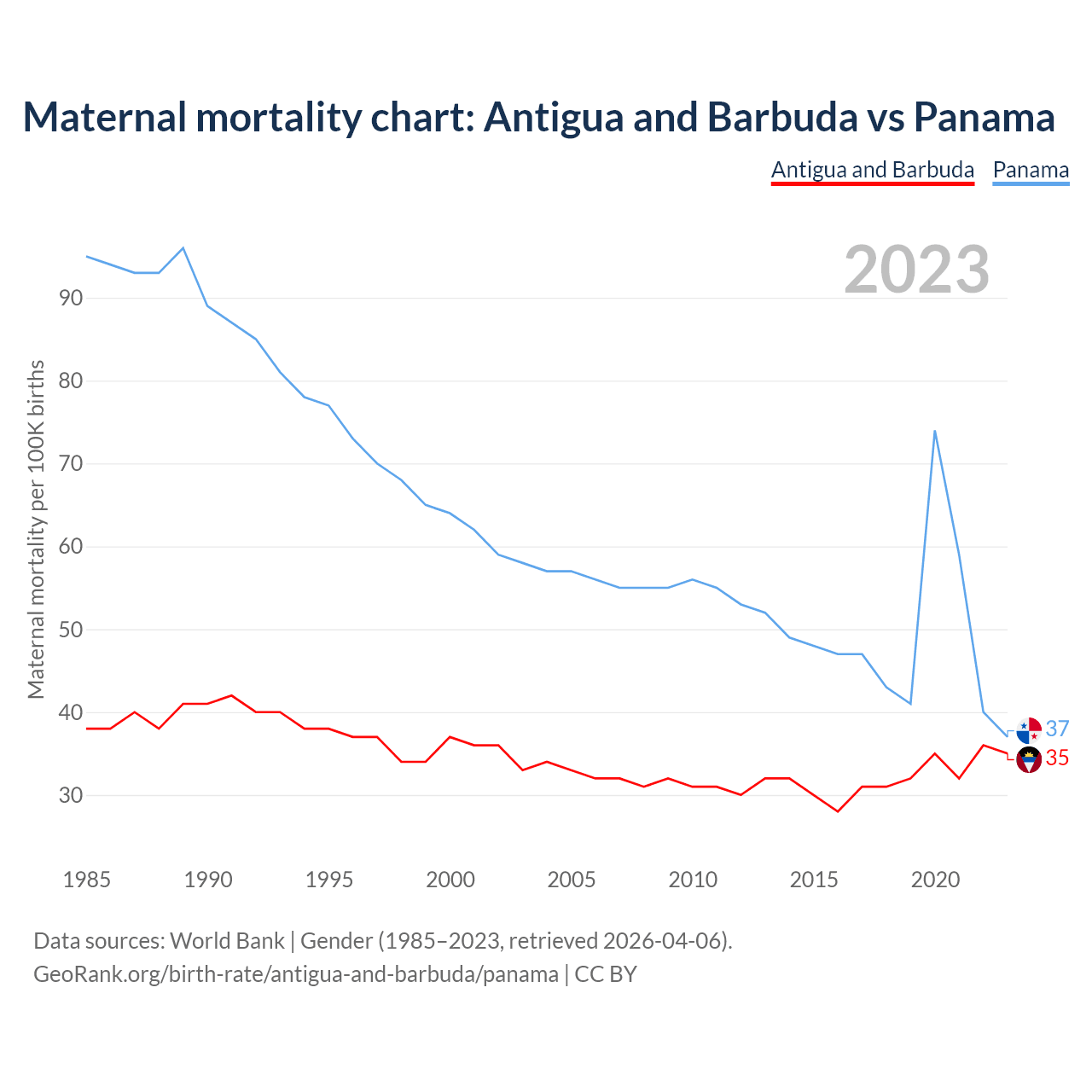 The maternal mortality rate, which is the probability of dying during childbirth or within 42 days of pregnancy termination, is 35 deaths per 100,000 live births in Antigua and Barbuda, compared to 37 deaths in Panama.