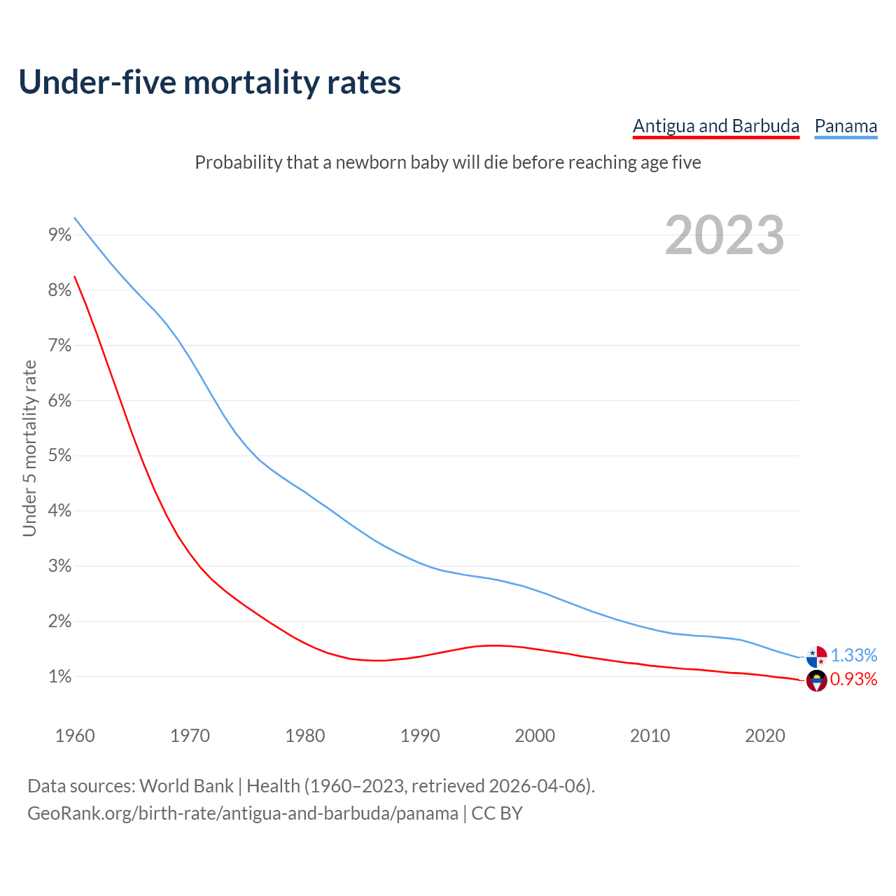 The chance that a newborn baby will die before reaching age five is 0.93% in Antigua and Barbuda and 1.33% in Panama. Above is a chart with historical data on under-five mortality rates.