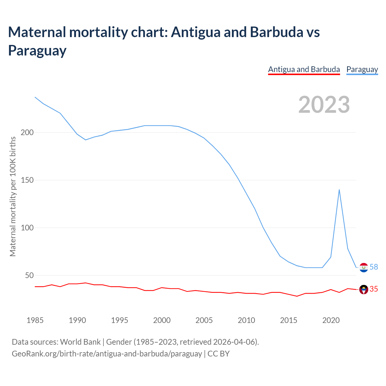 The maternal mortality rate, which is the probability of dying during childbirth or within 42 days of pregnancy termination, is 35 deaths per 100,000 live births in Antigua and Barbuda, compared to 58 deaths in Paraguay.