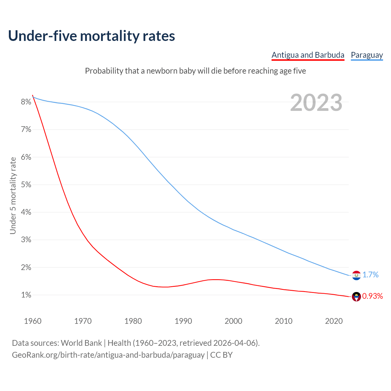 The chance that a newborn baby will die before reaching age five is 0.93% in Antigua and Barbuda and 1.7% in Paraguay. Above is a chart with historical data on under-five mortality rates.