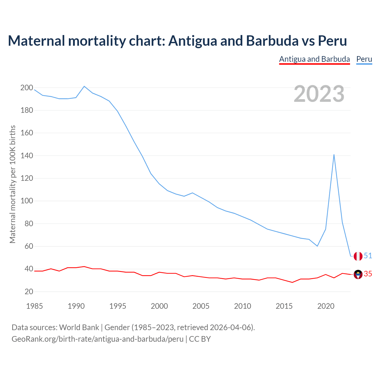 The maternal mortality rate, which is the probability of dying during childbirth or within 42 days of pregnancy termination, is 35 deaths per 100,000 live births in Antigua and Barbuda, compared to 51 deaths in Peru.