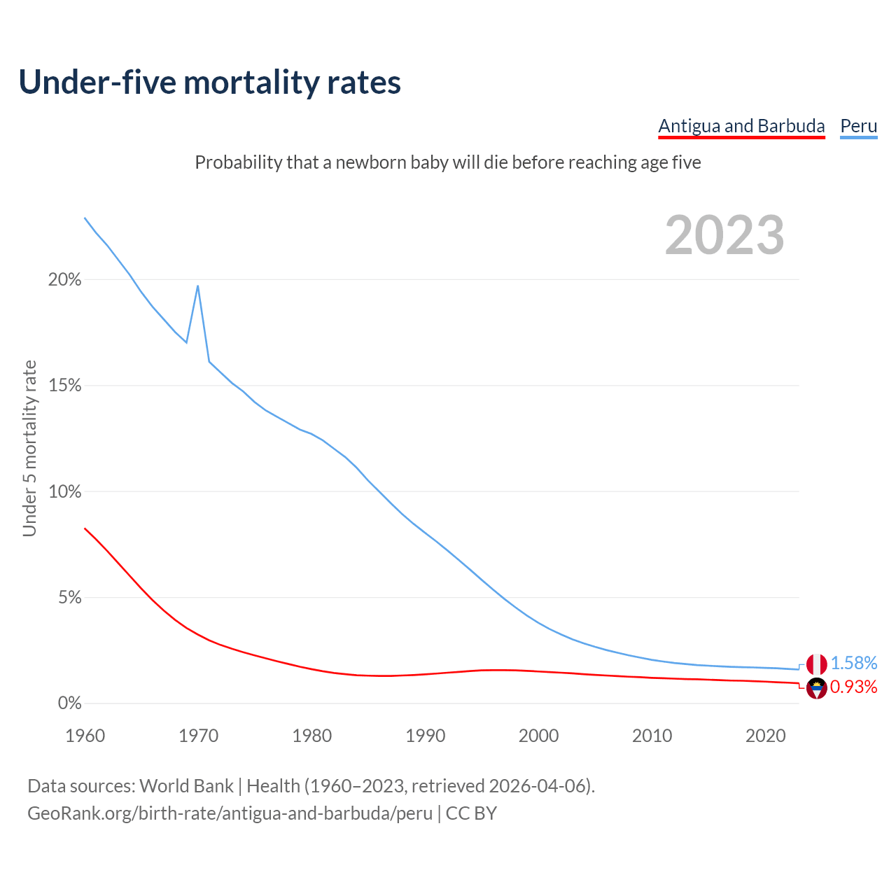 The chance that a newborn baby will die before reaching age five is 0.93% in Antigua and Barbuda and 1.58% in Peru. Above is a chart with historical data on under-five mortality rates.