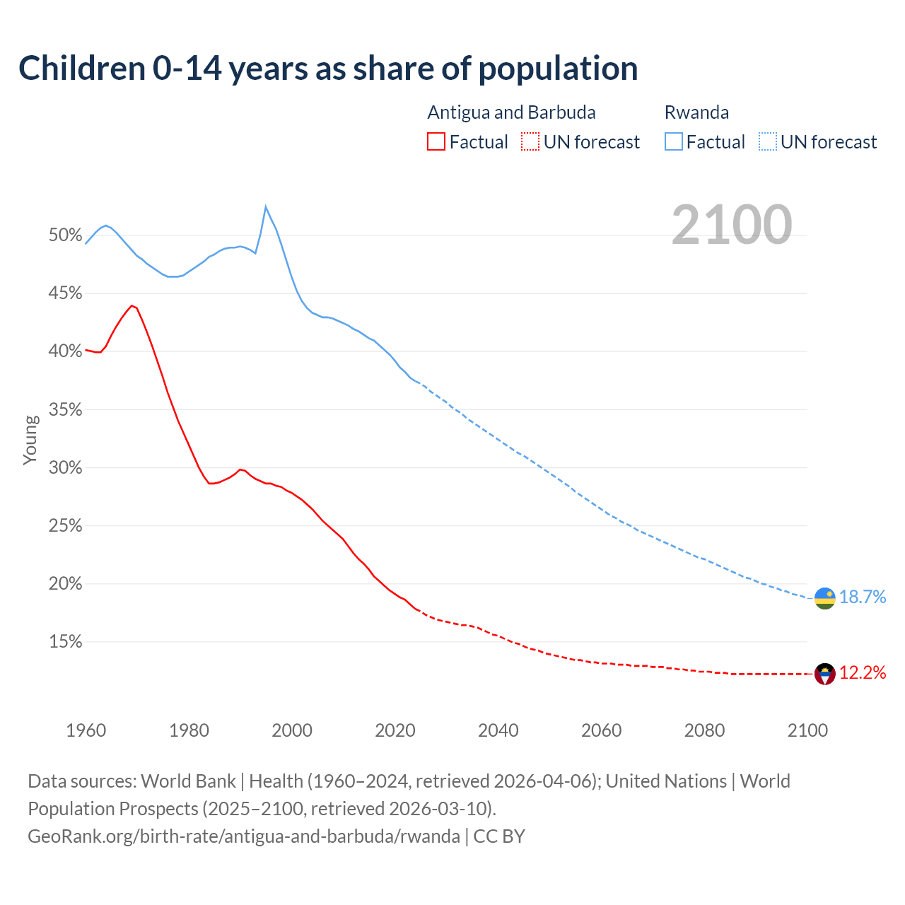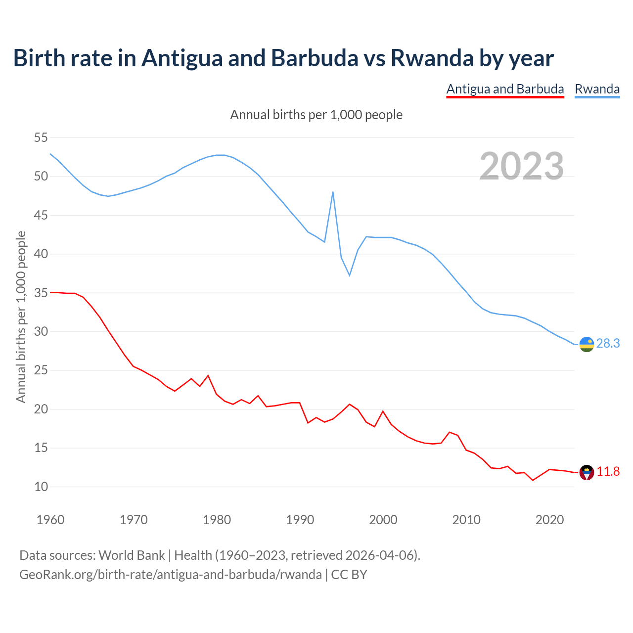 Antigua and Barbuda has an annual birth rate of 11.8 births per 1,000 people, compared to 28.3 for Rwanda. The average number of children a woman is expected to have during her lifetime — the fertility rate, is 1.58 in Antigua and Barbuda and 3.7 in Rwanda — 134.3% difference.