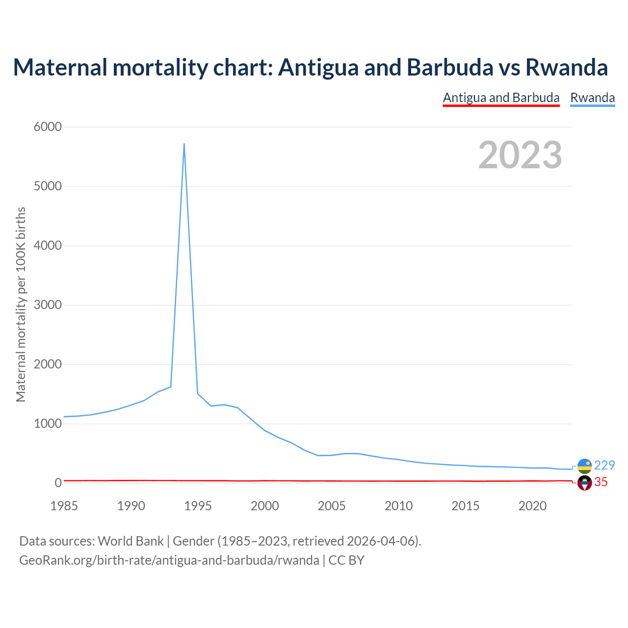 The maternal mortality rate, which is the probability of dying during childbirth or within 42 days of pregnancy termination, is 35 deaths per 100,000 live births in Antigua and Barbuda, compared to 229 deaths in Rwanda.