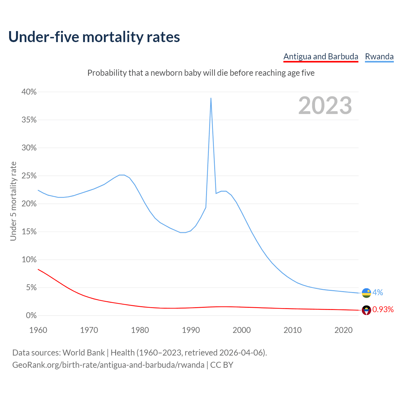 The chance that a newborn baby will die before reaching age five is 0.93% in Antigua and Barbuda and 4% in Rwanda. Above is a chart with historical data on under-five mortality rates.