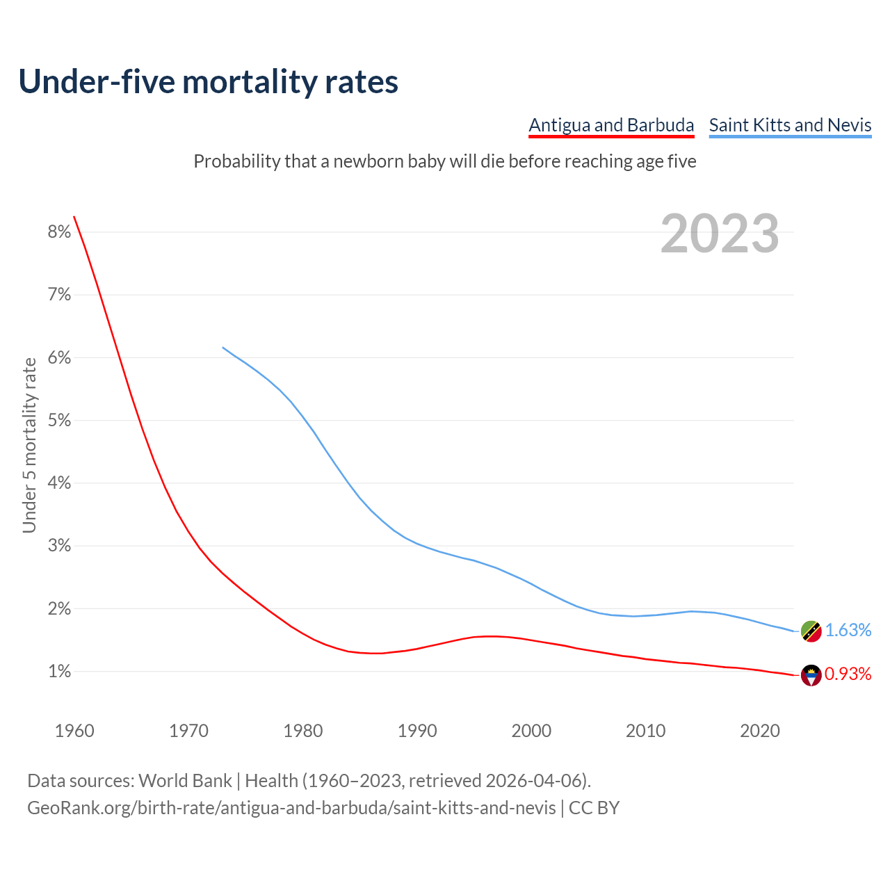 The chance that a newborn baby will die before reaching age five is 0.93% in Antigua and Barbuda and 1.63% in Saint Kitts and Nevis. Above is a chart with historical data on under-five mortality rates.
