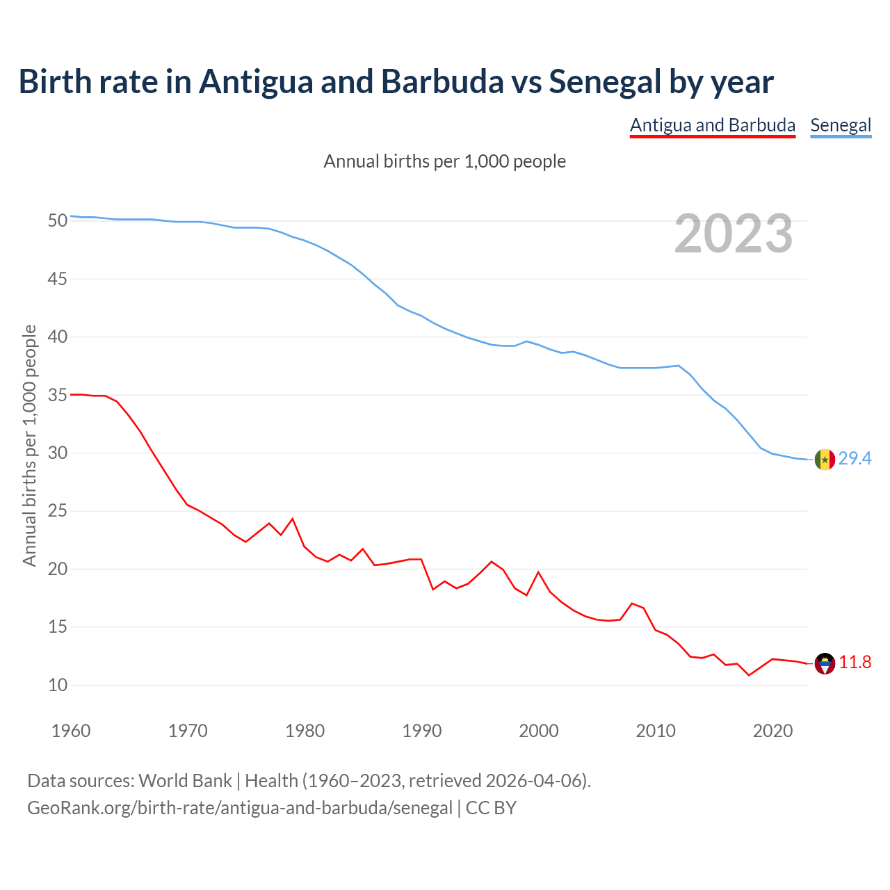 Antigua and Barbuda has an annual birth rate of 11.8 births per 1,000 people, compared to 29.4 for Senegal. The average number of children a woman is expected to have during her lifetime — the fertility rate, is 1.58 in Antigua and Barbuda and 3.82 in Senegal — 142% difference.