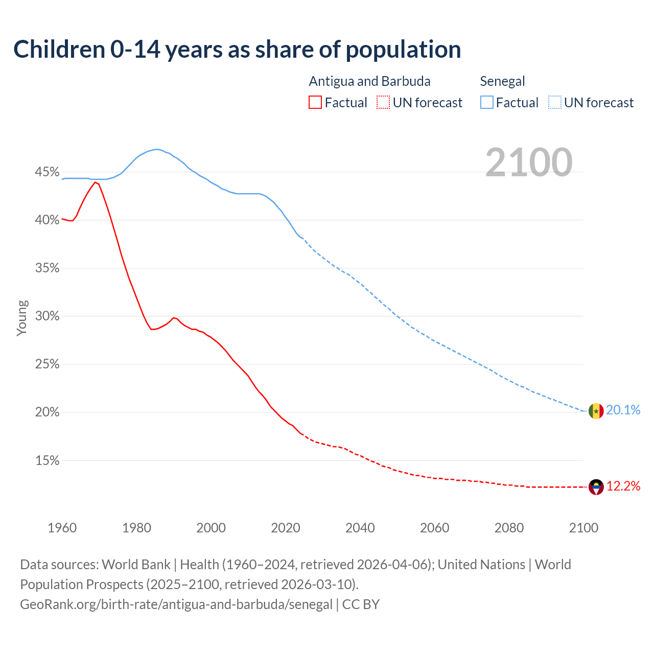 According to the latest available data on birth rates, the fertility rate in Antigua and Barbuda was 1.58 children per woman in 2023, compared to 3.82 in Senegal in 2023. The replacement level is considered to be 2.1 children per woman.