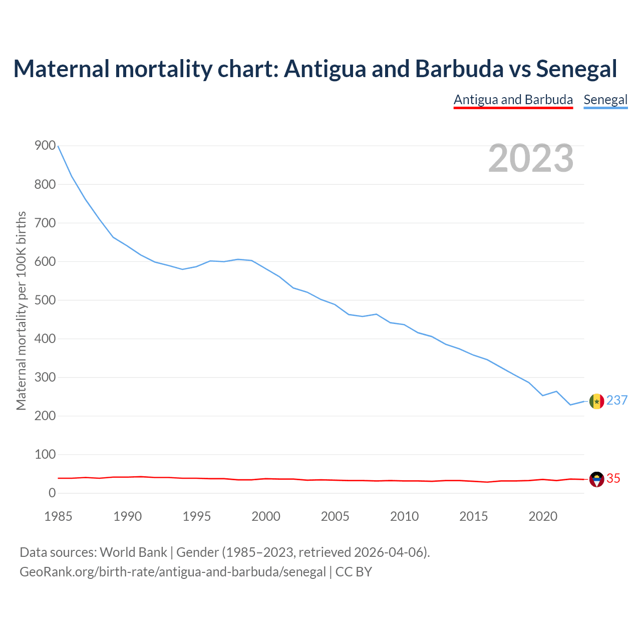 The maternal mortality rate, which is the probability of dying during childbirth or within 42 days of pregnancy termination, is 35 deaths per 100,000 live births in Antigua and Barbuda, compared to 237 deaths in Senegal.