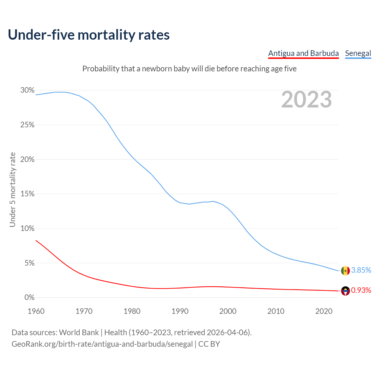 The chance that a newborn baby will die before reaching age five is 0.93% in Antigua and Barbuda and 3.85% in Senegal. Above is a chart with historical data on under-five mortality rates.